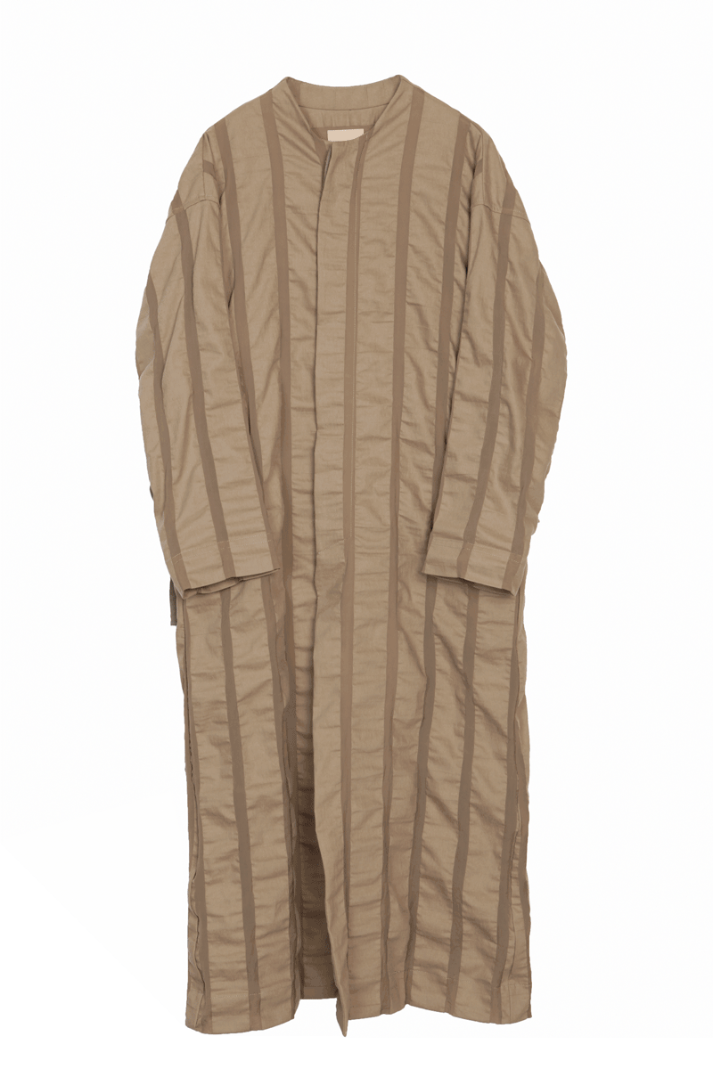 长款风衣外套,大身竖条纹,拉长比例,后身下半部的竖纹部分与本布相连,后背部横条纹飞片,搭与外层,后身整体呈假两件效果,横条竖条相互碰撞,个性剪裁,层次丰富。
