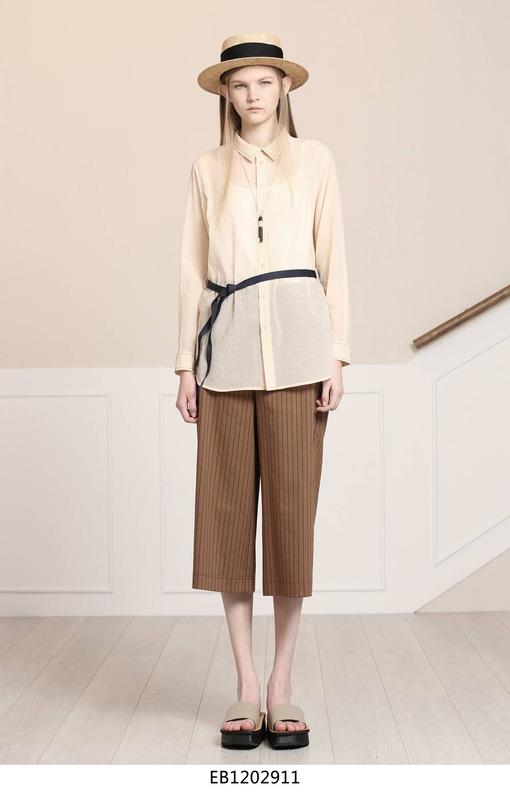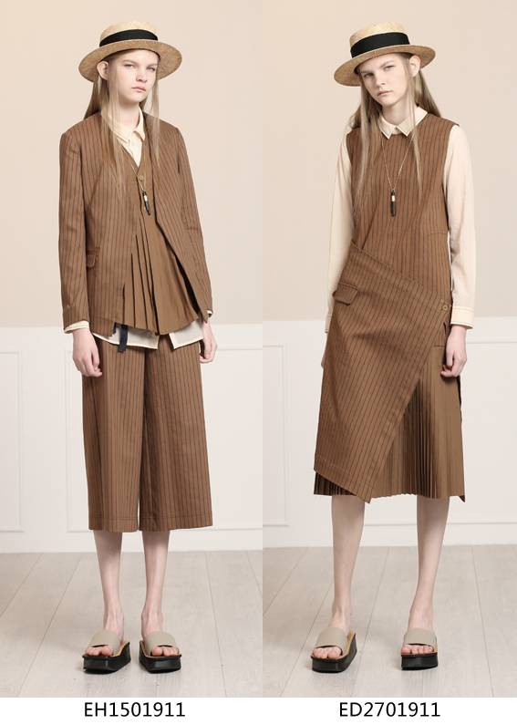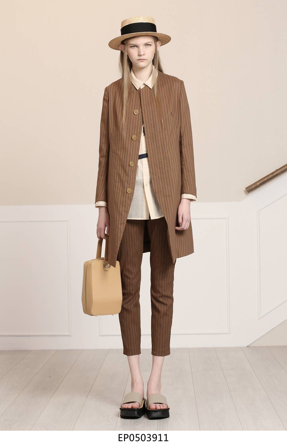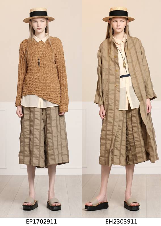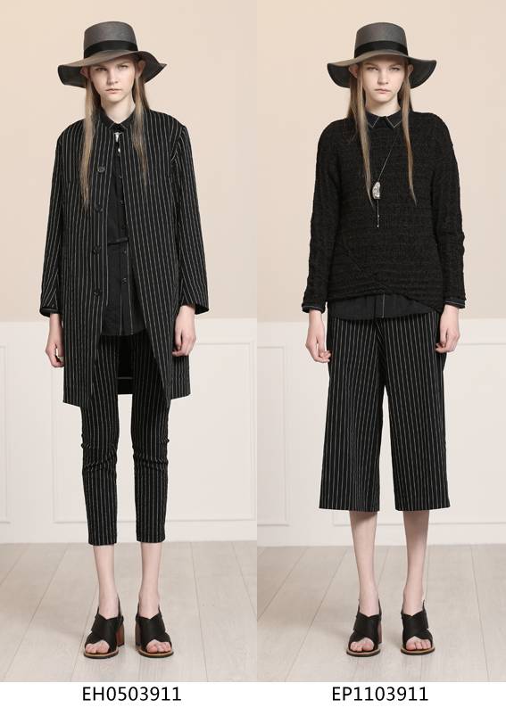 经典式小脚裤与条纹弹力面料相结合,修饰了腿型,结合经典条纹又不失一丝复古感,与本系列风衣外套搭配更增添一丝干练与个性。