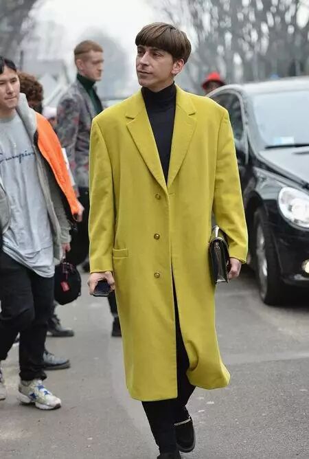 一看到这样的型男,相信不少少女们又要尖叫了。军蓝色与柠檬绿色的衬衫搭配出各种绅士街头风度感。而在整个造型之中最有特色的还是要数,将衬衣与高领衫搭配修身西裤之上。尖头皮鞋让整个造型看起来非常时尚。