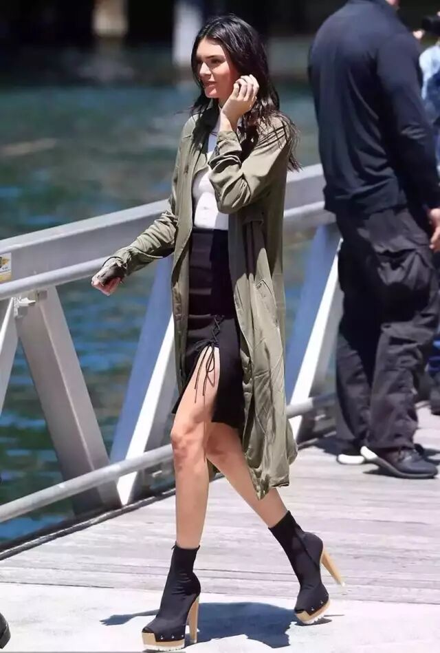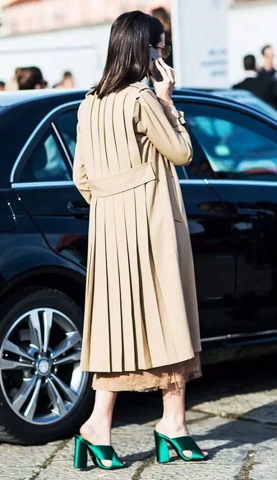 2、高挑身材:及膝或者膝盖以下的长款风衣;