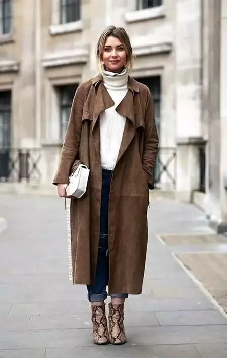 推荐理由:风衣防风,高领毛衣保暖。下身根据风格自由选择,可以是紧身裤、包臀裙+高跟鞋(短靴);也可以是呢料小西裤+小白鞋(皮鞋)。知性与随性,自由搭配哦!