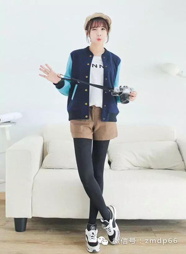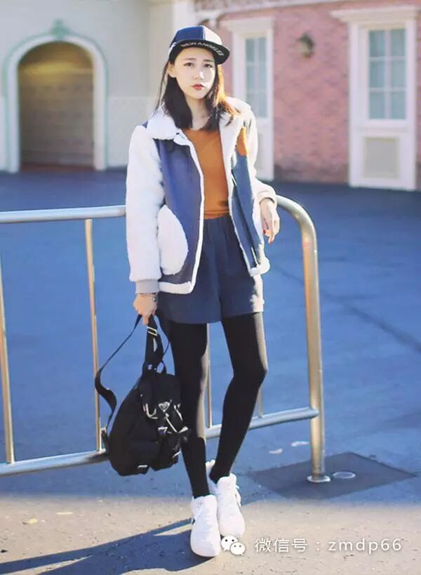 运动休闲装扮也不能改变短裤的作用,阔腿短裤,大大的裤腿显得大腿纤细,蓝色的棒球外套与棒球帽的搭配,把视线整体转移到上半身,忽视下半身的腿长。