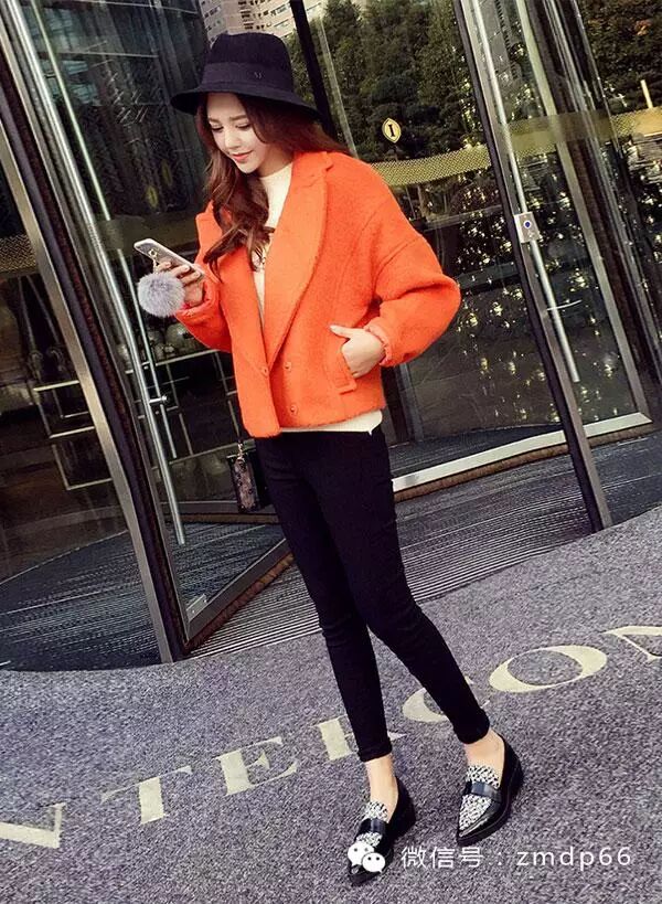 橘色的短外套,强烈的颜色与简单又大方的服饰搭配黑色九分裤没加上尖头皮鞋,时尚中有种it girl的即视感。