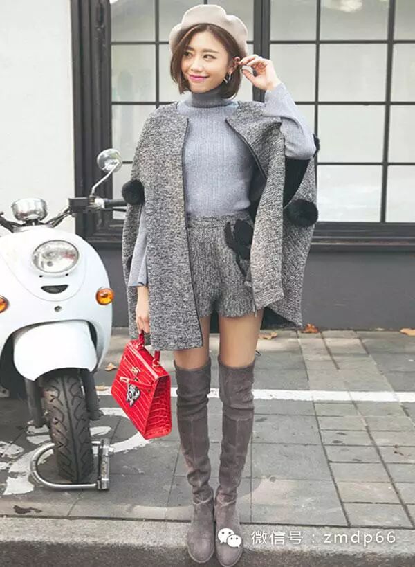 短裤是必不可少的搭配单品之一。灰色系列的服饰,即低调又突显自己的优雅与大方,高腰的短裤拉长腿型,又把上下比例得到一定的调整,高筒靴显得腿型又长又直。