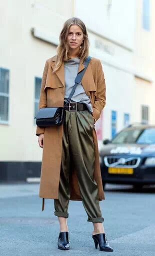 帅气的风衣怎么穿?搭配一条天府绸廓形高腰裤,卷起裤脚拉长下身比例,同时超长风衣弱化整体线条,看上去十分帅气。
