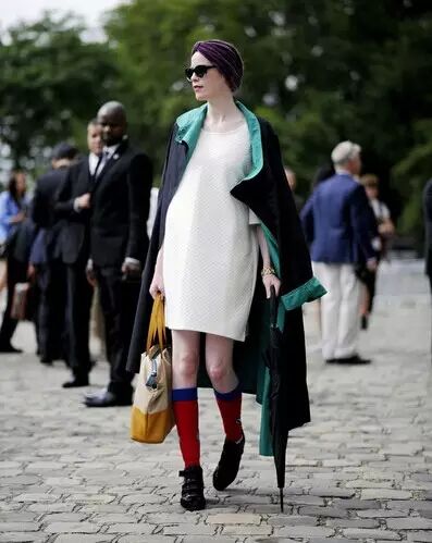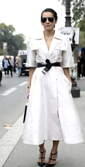 深色超长风衣搭配白色连衣裙,巧妙的遮盖了肩部腰部线条,即使是容易膨胀的白色单品也看起来十分显瘦。