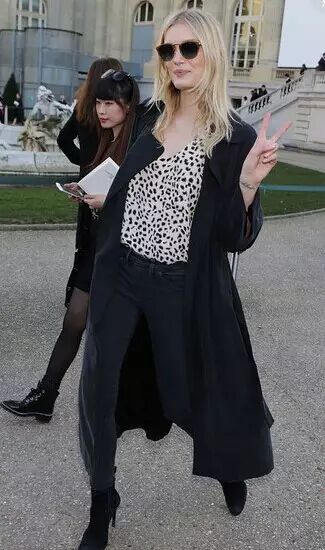 深色风衣飘逸的裙摆和紧身裤形成鲜明的对比,搭配高跟鞋和简约衬衫,去除多余的缀饰,看上去简单纤细。