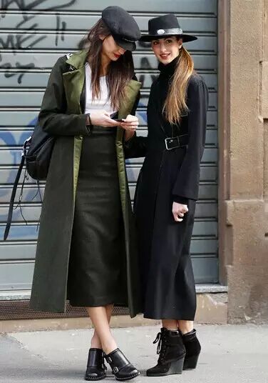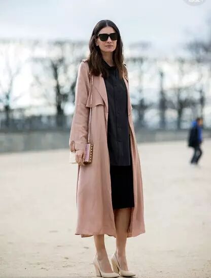 在超长风衣的搭配上,巧用颜色绝对是制胜关键,尽量选择内外搭配对比度高的单品,如黑色裙装搭配裸色超长风衣,两种对比度强的单品营造出纤细的视觉效果。