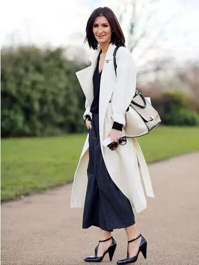 如果选择浅色风衣款式,请内搭深色套装或裙装,黑白对比展现出简约的线条美,一双T字高跟鞋轻松点睛。