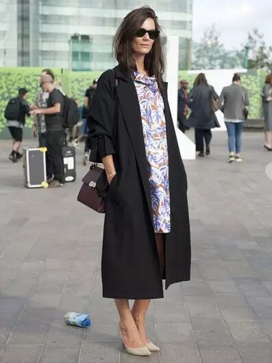 若选择印花连衣裙,黑色超长风衣搭配就再恰当不过了,慵懒的挽起袖管,将精致女人味展现的淋漓尽致。
