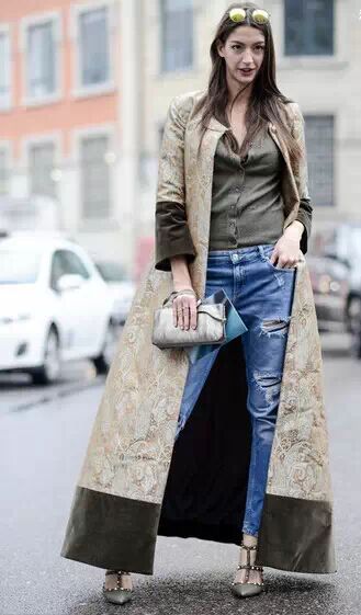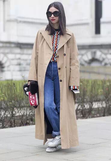 即使选择内搭牛仔裤,也不要忘记在腰部搭配一条点睛腰带,同时,选择及地超长风衣,拉长身材比例。