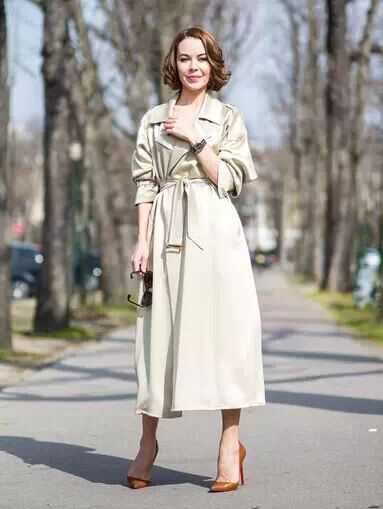丝绸款式超长风衣给人一种高贵优雅的感觉,廓形简约的风衣剪裁和腰间的同色系腰带搭配,展现漫不经心的女人味。