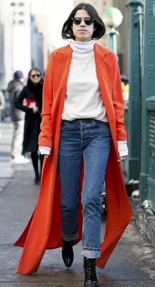 鲜艳色系的超长风衣一定要敞着穿,随着步伐摆动的风衣,营造出一种帅气的女人味。