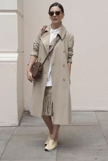 小个子女生可以选择与风衣下摆同样长度的内搭半身裙,增添内外的层次感,颜色上以经典驼色为主,切忌内长外短的搭配方式。