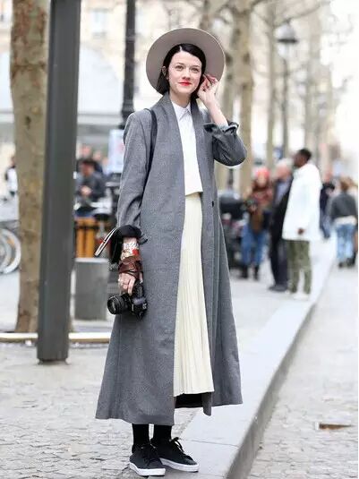 简洁的灰色超长风衣让线条如流水一般流畅,白色内搭长裙与风衣外套的长度恰当,露出脚踝,减重效果明显。