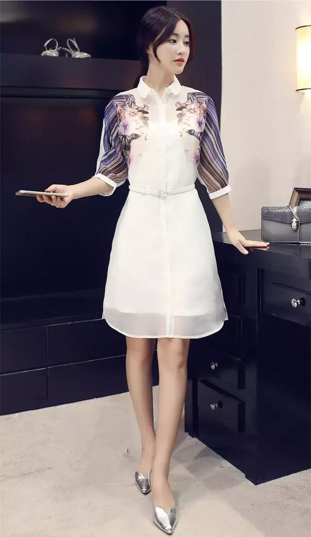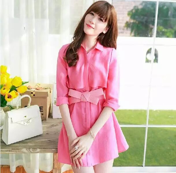 精致的蝴蝶结腰带,可爱的小翻领,时尚靓丽的长袖衬衫裙!