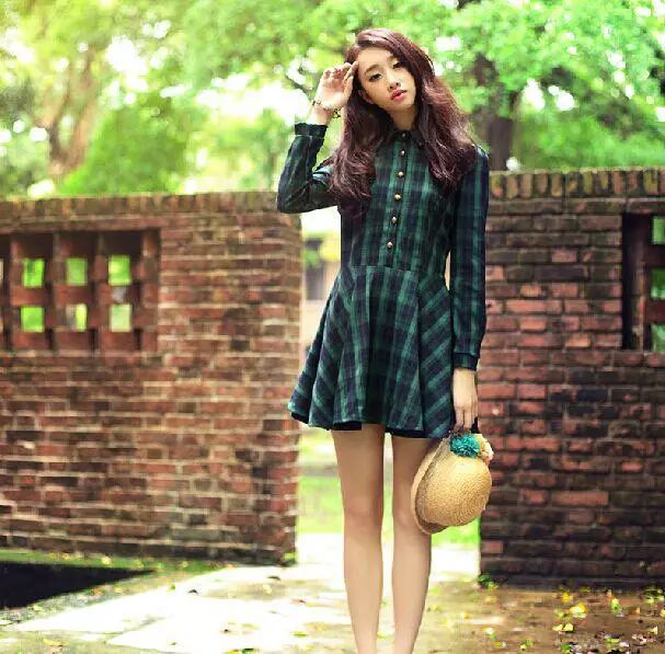 森女系连衣裙,修身的百褶设计,时尚的衬衫款式,还是格子图案哦!