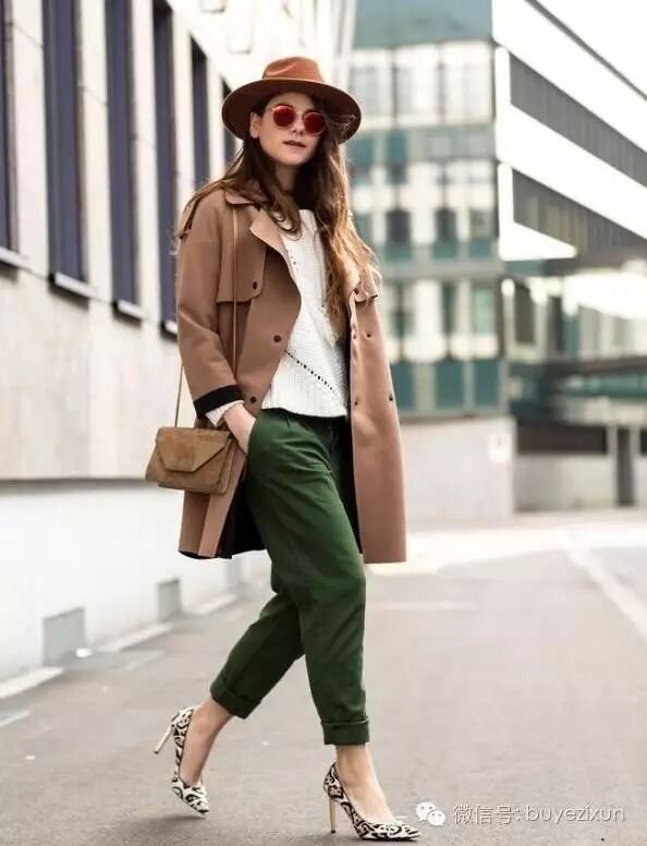 如果觉得简单搭配太过单调,动物纹的尖头高跟鞋绝对是吸睛度爆表的单品,大胆的搭配橄榄绿的长裤,为整体的造型增添了浓郁的色彩,再搭配一个羊毛帽瞬间变身时尚达人。
