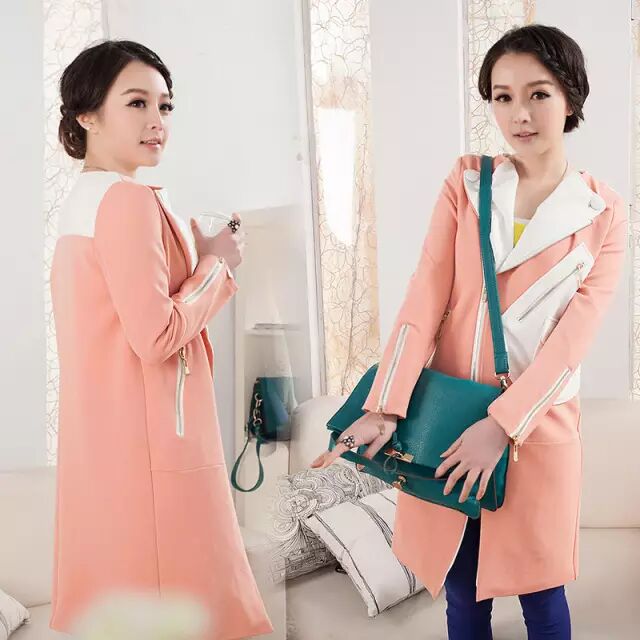 直筒版型风衣极具修身效果,粉嫩的颜色衬得人年轻有气色,白色拼接口袋与翻领时髦有设计感。