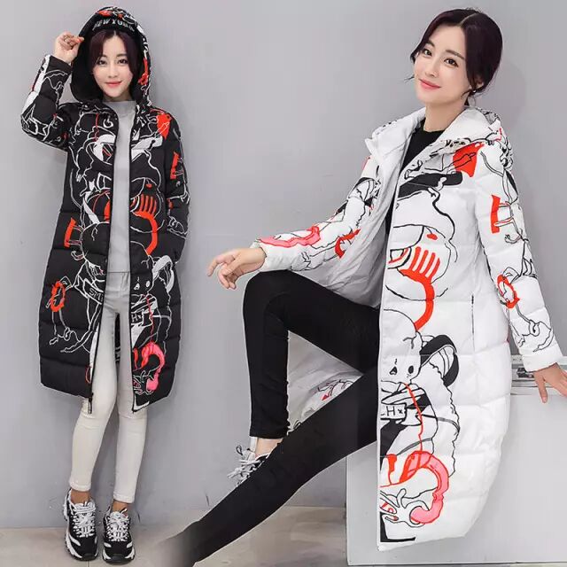 街头涂鸦印花的中长款棉服,在寒冷的冬天走在街上,瞬间就赚足百分百回头率了,修身版型,穿得暖暖也不会有臃肿感