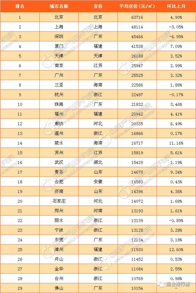 榜单显示,万元以上城市前十名分别是:北京、上海、深圳、厦门、天津、南京、广州、三亚、杭州和珠海。除了三亚和杭州互换位置外,3月,房价前十排名与上月几乎一致。数据显示,广东省占据四城,浙江占六城,是房价上万城市最多的省份,但前十中,广东占据3城,其他省市各一城。另外,北京仍稳居榜首,其次是上海和深圳,广州排名第7位。