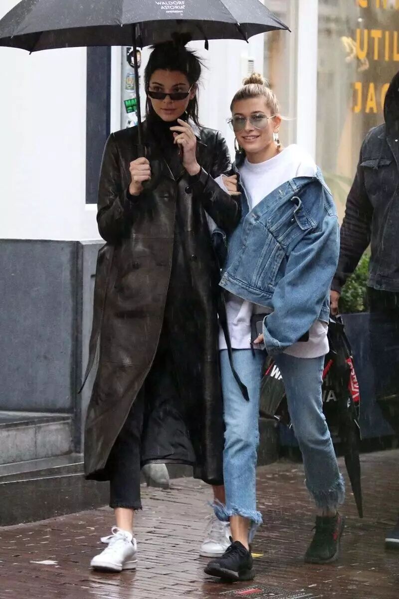 海狸跟肯豆漫步在雨中用一件设计独特的牛仔外套完成了舒适Chic 的出街造型,大一号与牛仔裤的磨边细节是时髦的关键。