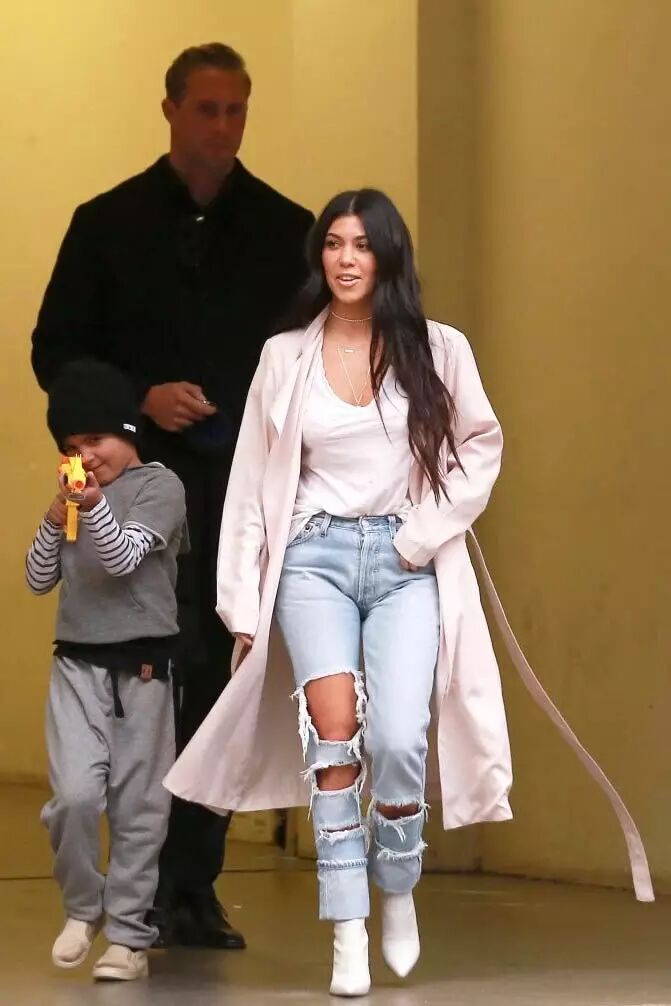这位辣妈带着儿子出门,她身穿裸粉色长袍,搭配白Tee、牛仔裤和白色裸靴,牛仔裤的不规则破洞元素增添整体细节。