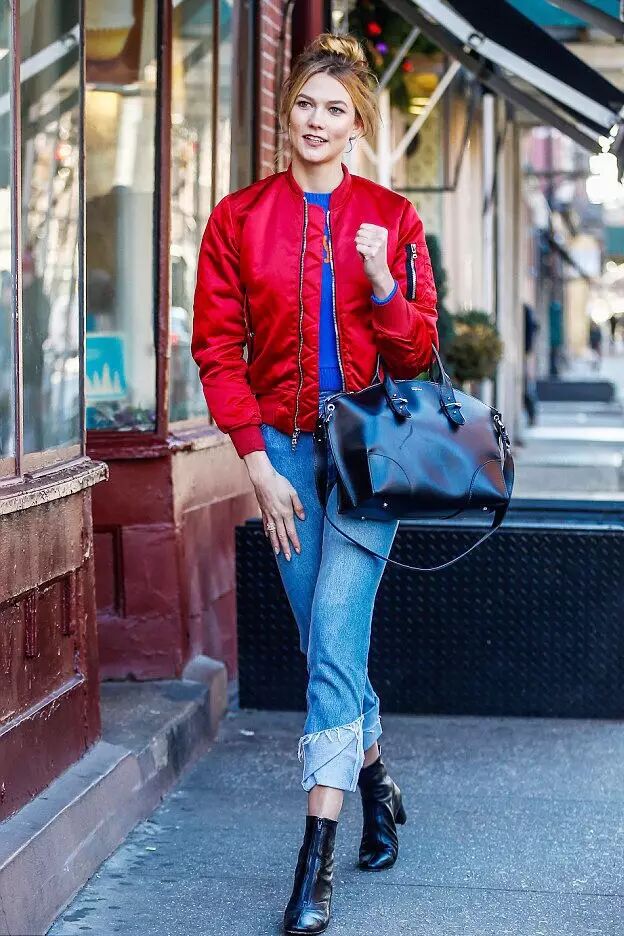 一抹亮红的飞行员夹克来袭,来助阵磨边牛仔,利落有型的整体,让这位女神看起来随意并带有几分帅气!