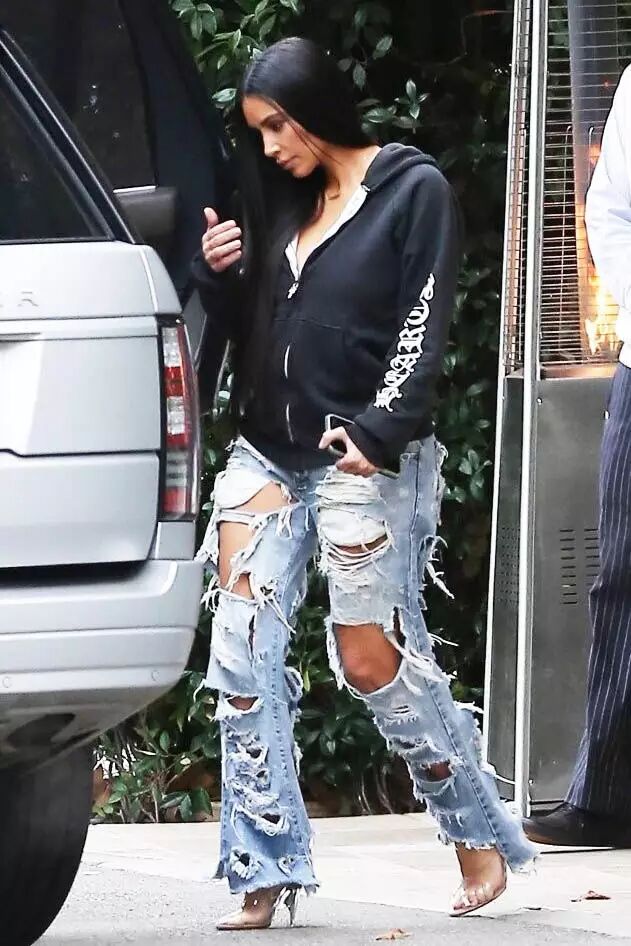 连帽卫衣搭配夸张的破洞牛仔裤,并用透明高跟加持,混搭的街头装扮很nice!