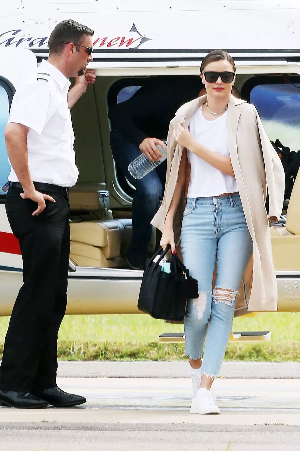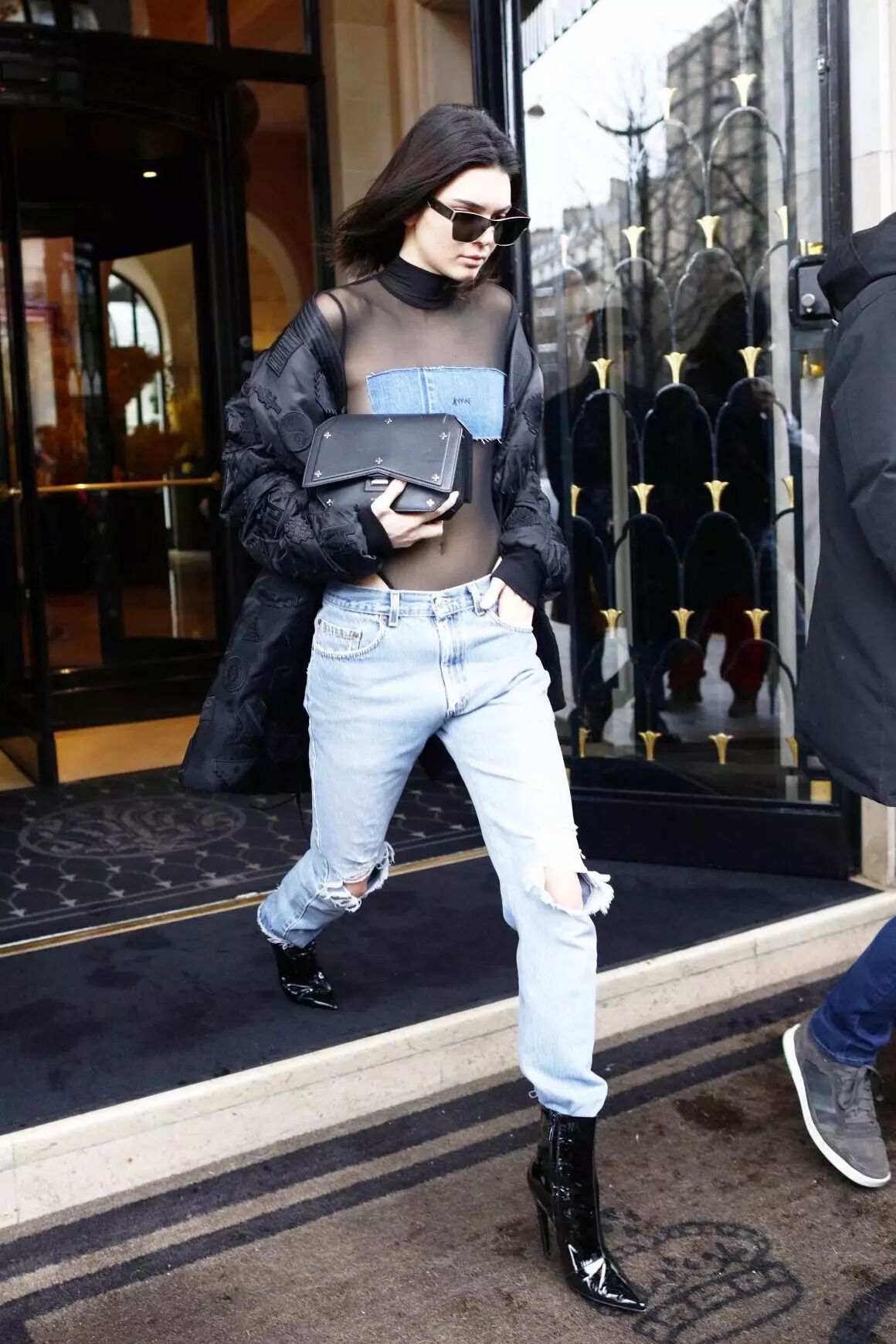 透视的连体衣把牛仔布贴在胸前,具备了新鲜感又与牛仔裤呼应,半穿外套手拿方包,并用漆皮尖头高跟鞋助攻,肯豆的造型回头率100%。
