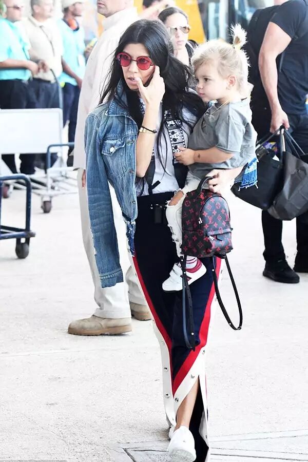 带着Baby外出,下身搭配运动裤+小白鞋,整体帅气感和运动风并存。