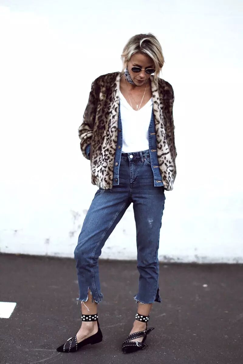 时尚博主身穿豹纹外套搭配牛仔服+白Tee,牛仔裤的毛边+开衩元素时髦吸睛,牛仔的休闲很好的中和了豹纹的野性!