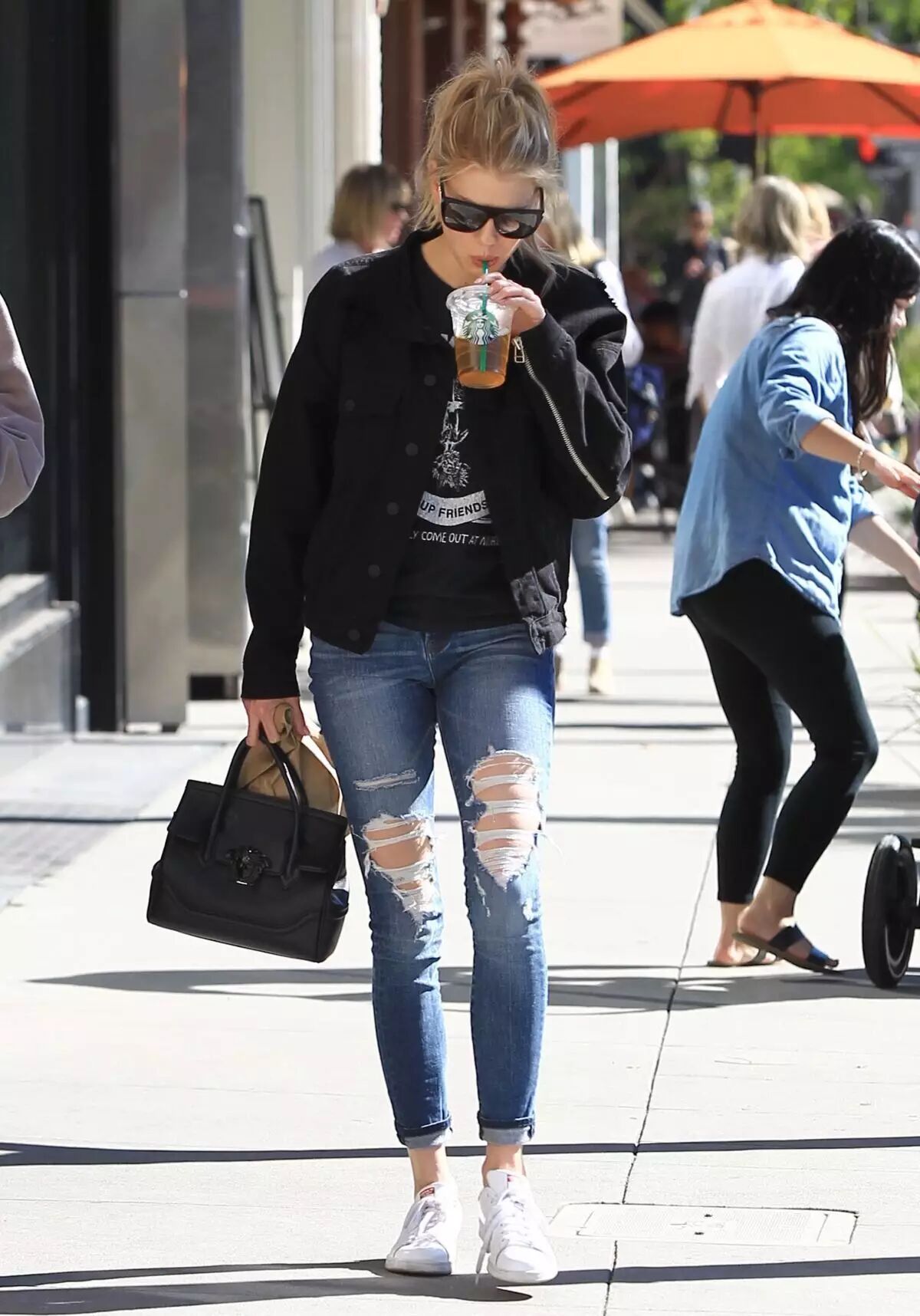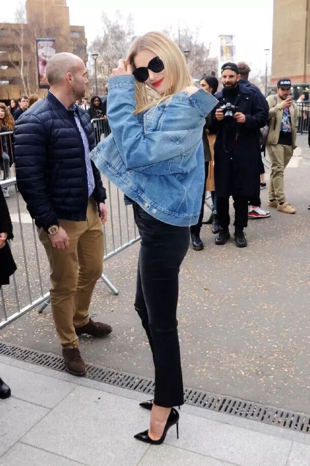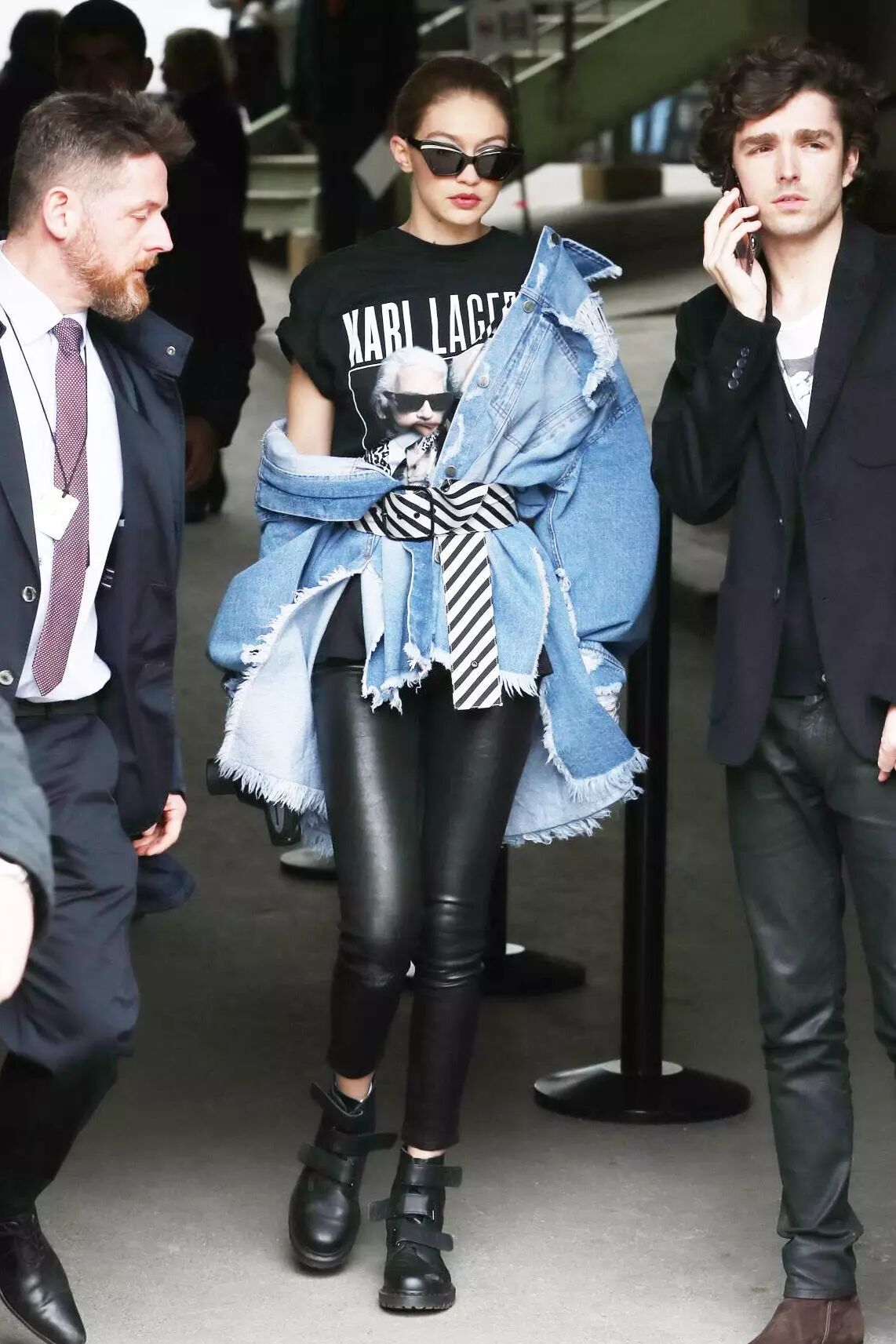 吉吉·哈迪德,她身穿黑色人像Tee+紧身皮裤,半身做旧牛仔外套并用条纹宽腰带加持,呈现帅气街头风。