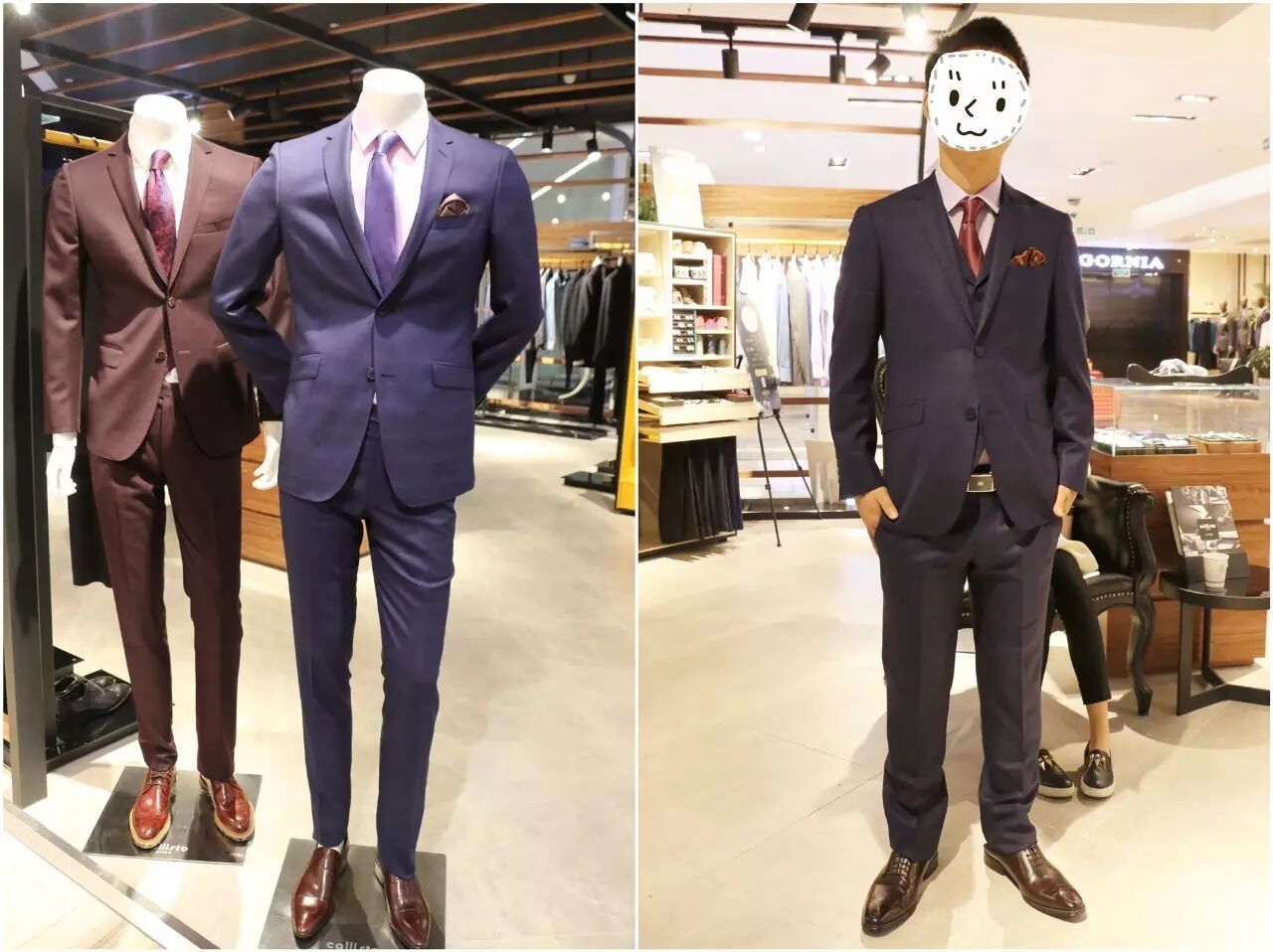 逛到这家的时候刚好遇到一位帅哥试西服,左边这套蓝色西装上身效果确实很棒,男人味max!