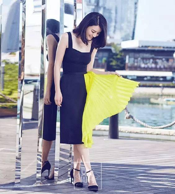 黑色紧身连衣裙配上亮黄色的百褶边,中和了单调暗沉的全黑色,变得活泼靓丽起来。