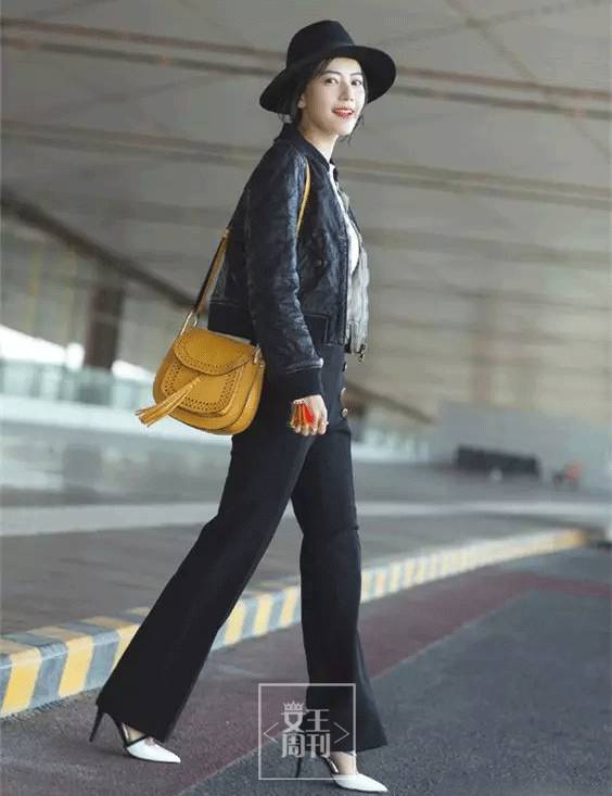圆边小礼帽让整体黑色造型更加完整和规矩,但黄色小挎包则让正经中过滤一些活泼的色彩,整体帅气又靓丽。