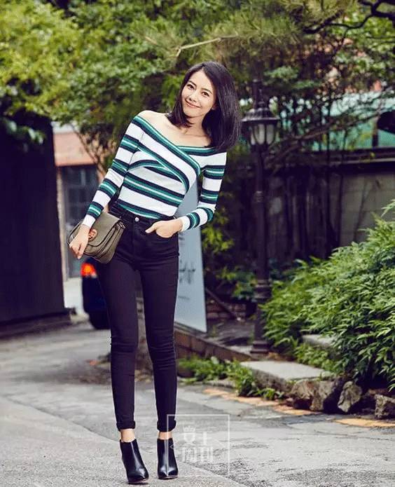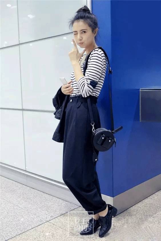 条纹之所以能成为经典单品,因为它显瘦而且不会过于单调。扎上超高丸子头,整个人都俏皮青春起来。