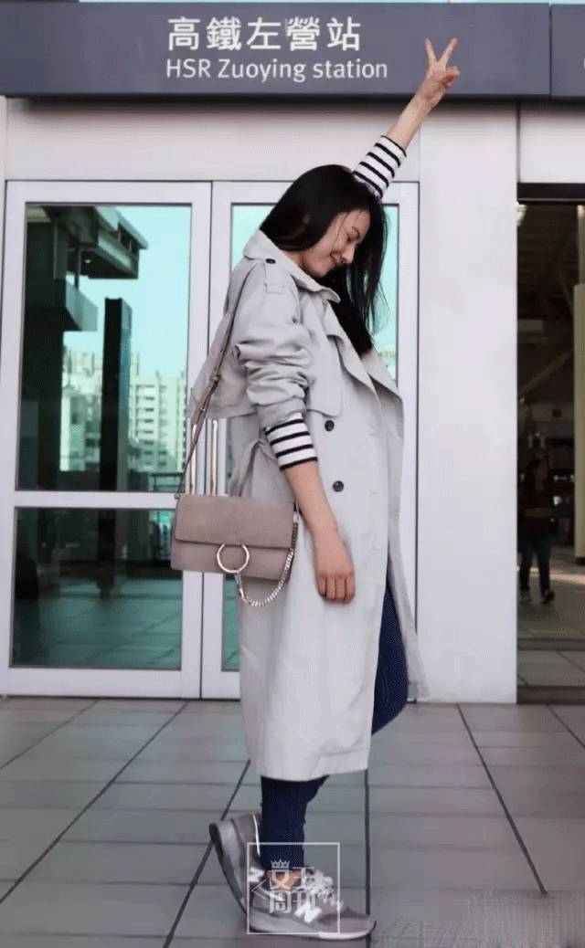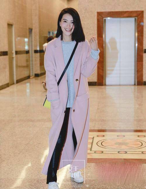 长款拖地风衣显得人高挑修长,粉嫩的颜色则充满少女气息。