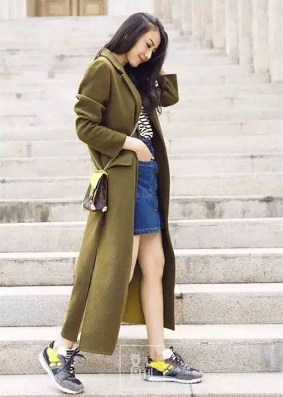 长款风衣与超短裙搭配,拥有逆天大长腿不是问题,运动鞋的混搭则让整个造型都充满活力。