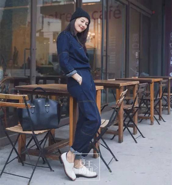 牛仔连体裤搭配黑色毛织帽,缓解了连体裤略单调的风格,俏皮又可爱。