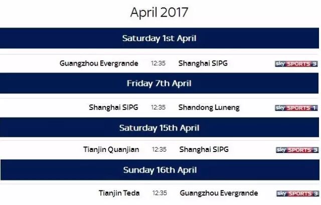 英国天空体育已确定的四月中超转播场次