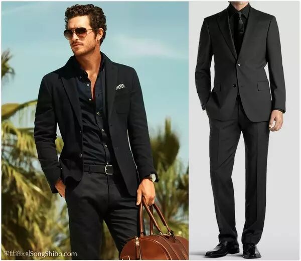 上面是搭配休闲装,下面是深色系衬衫搭配西装或者夹克的效果。注意右图,我个人以为,大多数时候黑色(深色)衬衫不打领带更好看。