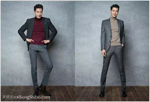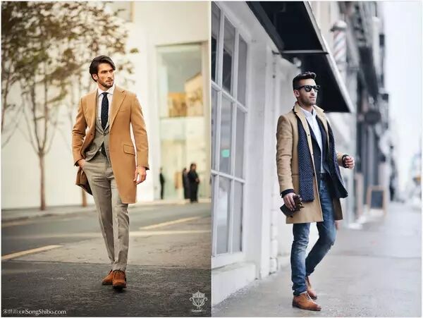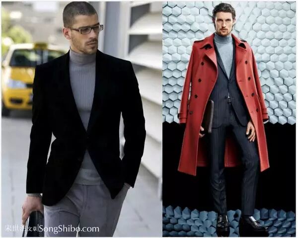 1.首选西装是灰色,高领毛衣是灰白色,驼色大衣是最好的搭配。当然,灰色,黑色、深蓝色搭配起来也没问题,只是不如驼色出彩;