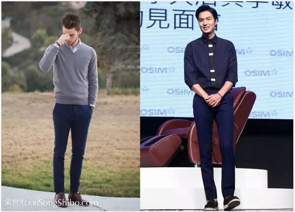 上图左浅蓝色衬衫搭配灰色V领毛衣和深蓝色休闲裤就很好,深蓝色休闲裤可以用西裤代替,如果你有藏青蓝或者黑色套装的话,就拆开来配吧,一件多用。