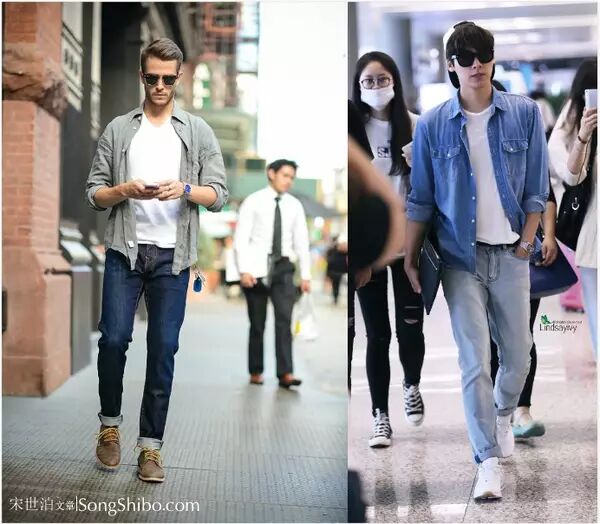 白|灰T恤也可以穿在白衬衫内;帆布鞋更适合非冬季,不过街头潮人冬天也喜欢穿。