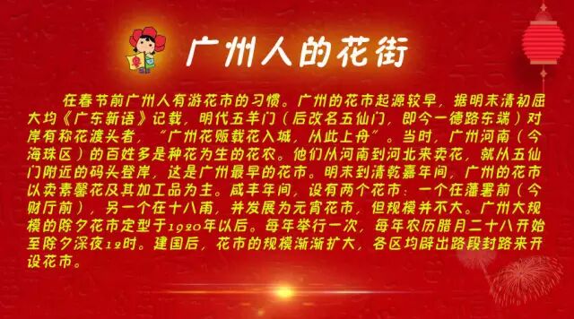 从清代同治、光绪年间开始,逐渐发展为一年一度的迎春花市!从农历十二月廿八日至除夕中夜,连续三日的花市有各色花卉与手工艺品。逛花街成为广州人重要的活动,有“花海人潮十里长”的美誉。