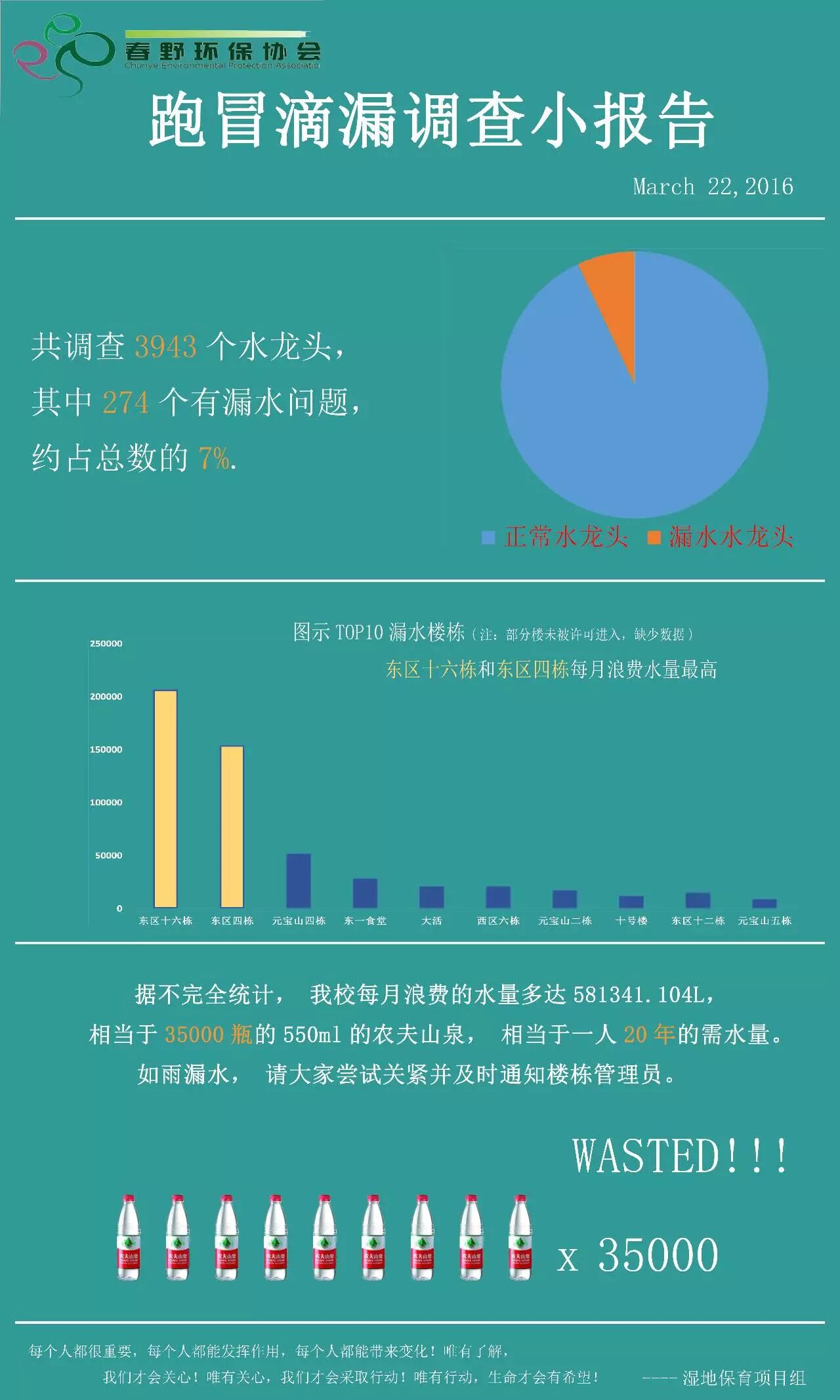 【活动内容】跑冒滴漏是一场通过实地调查的方式了解学校各处的水龙头损坏情况及漏水情况的志愿活动。旨在通过数据来让大家了解我校水资源浪费的情况,同时积极向学校相关部门反映情况,使损坏的水龙头得到修复,达到节约用水的目的。