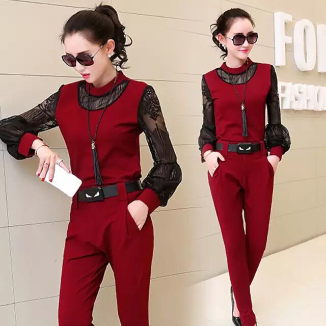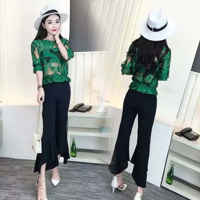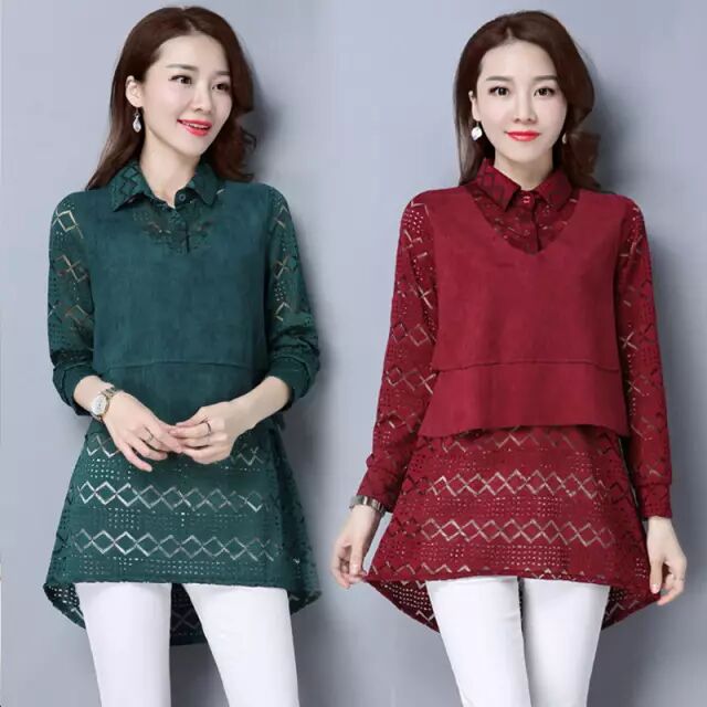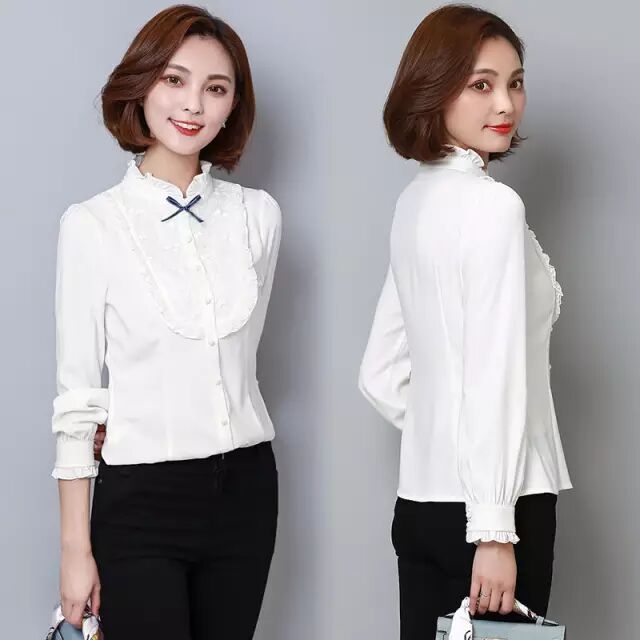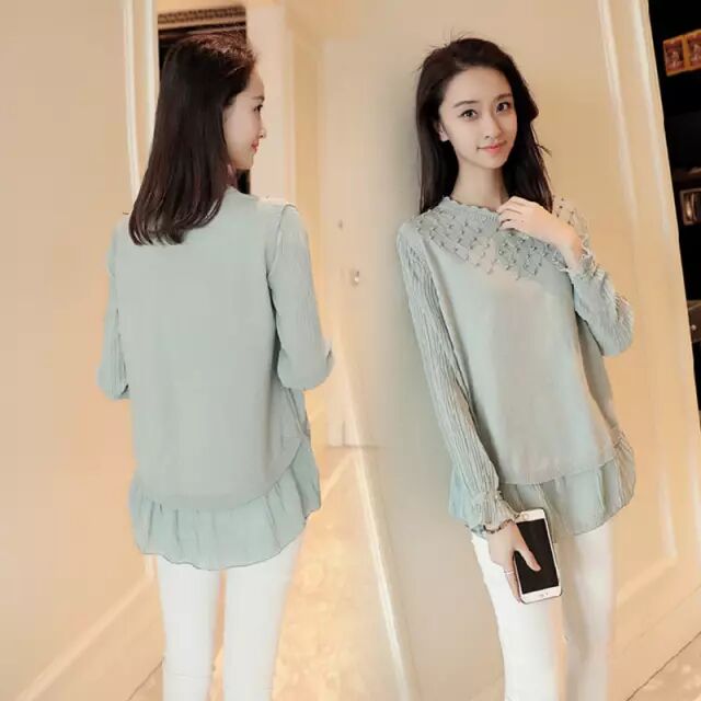 纯色蕾丝拼接抽褶荷叶边百搭长袖蕾丝衫