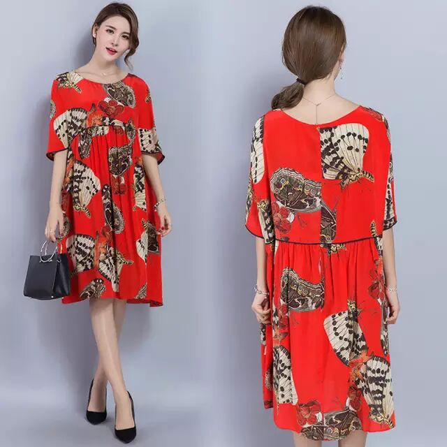 2017新款蝴蝶印花圆领蝙蝠中袖连衣裙