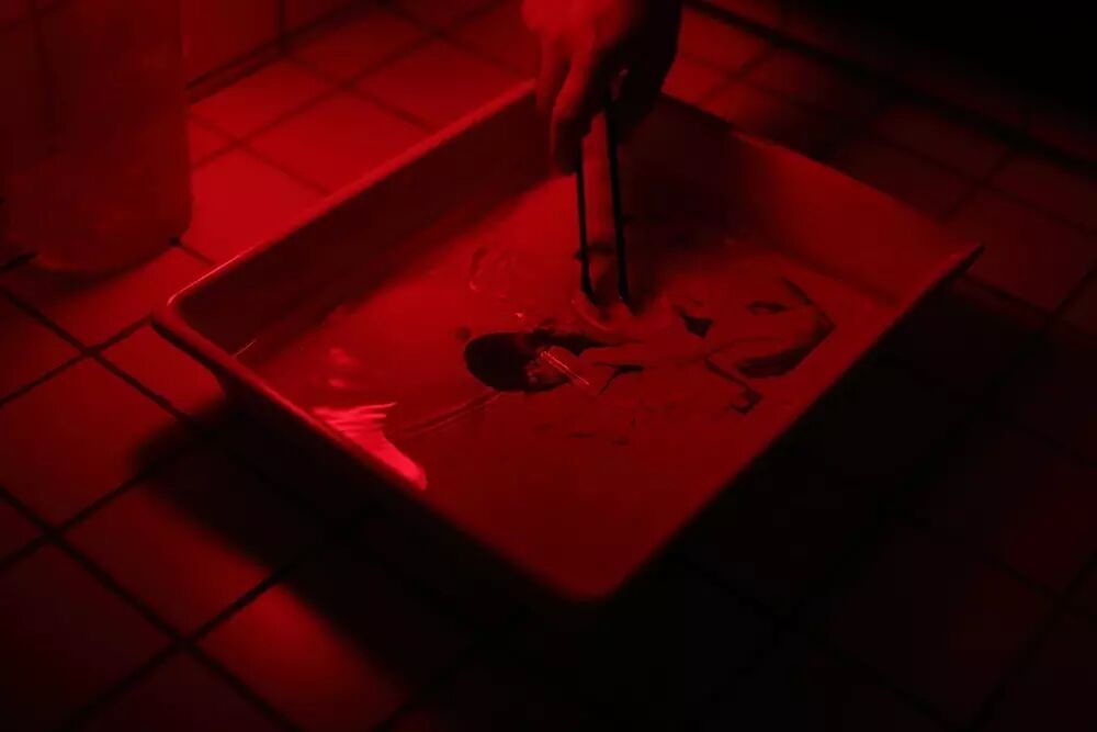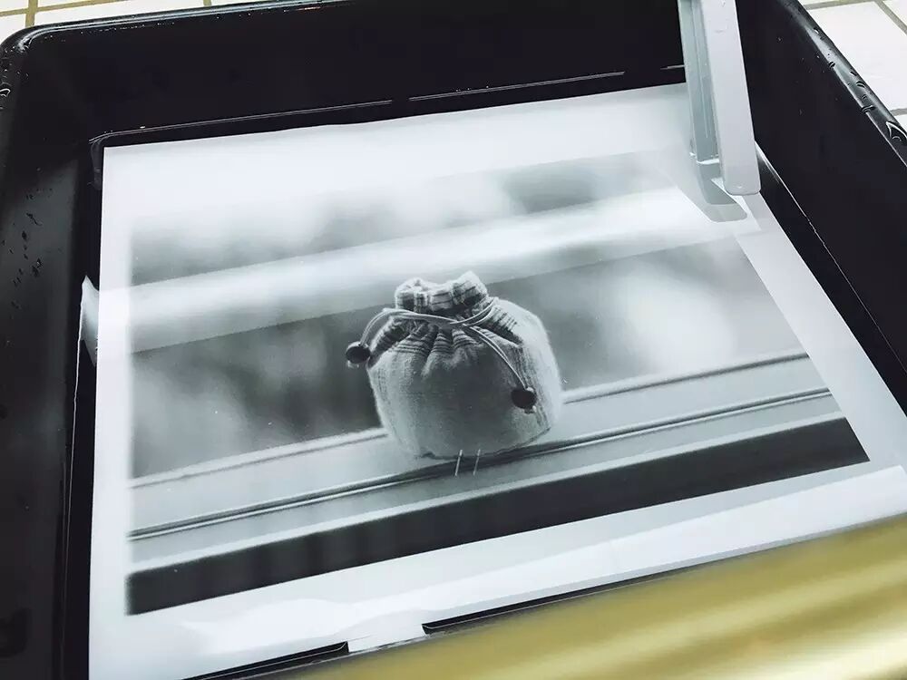 接触印相后还可以体验照片放大,把底片放在玻璃盒中插入放大机,首先需要打试条进行测光,定好正确的曝光值后,打开灯,影像便会投影在下面的白板上,可以通过放大机来进行调焦,配合白板上的标尺来确认成像大小。相纸经放大机曝光过后,再进行显影、停显、定影、水洗的步骤,最终成像。影像在药液中直观显影的过程,正是暗房魅力的精髓所在。